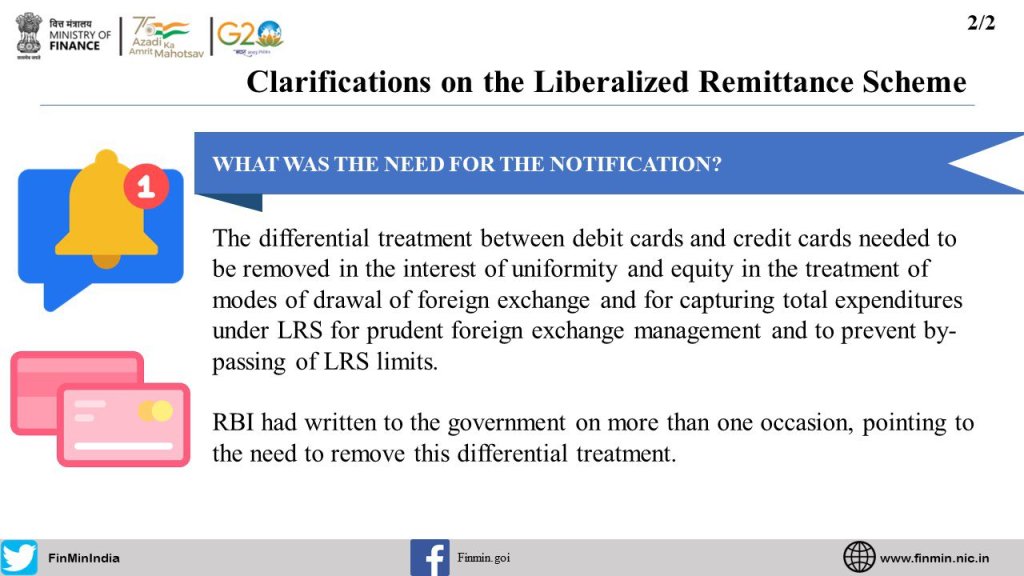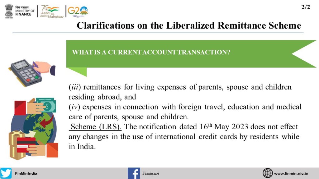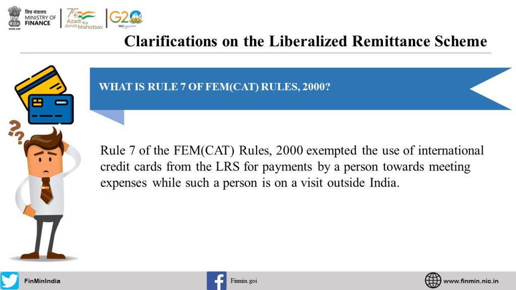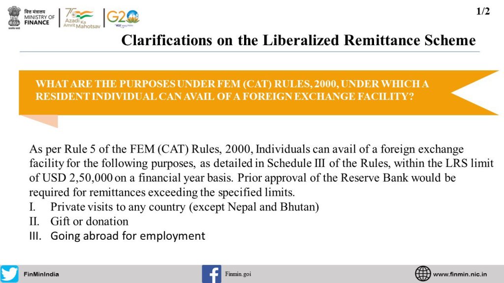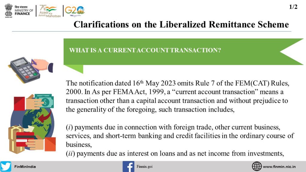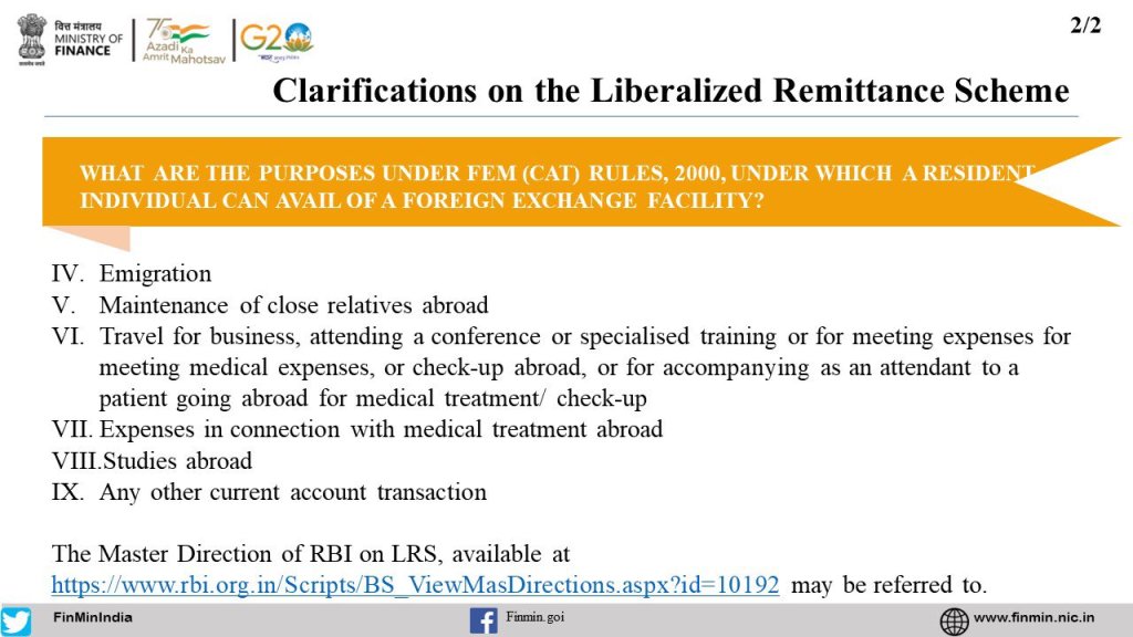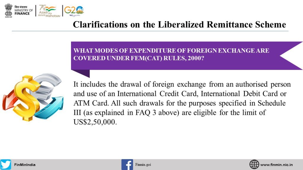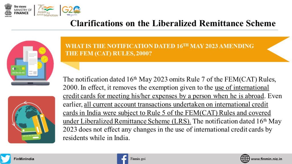 Here are the Frequently Asked Questions #FAQS w.r.t. the Liberalised Remittance SchemeWhat is the notification dated 16th May 2023 amending the FEM (CAT) Rules, 2000?What is Rule 7 of FEM(CAT) Rules, 2000?What was the need for the notification?What modes of expenditure of foreign exchange are covered under FEM(CAT) Rules, 2000?What are the purposes under FEM (CAT) Rules, 2000, under which a resident individual can avail of a foreign exchange facility?Does LRS cover business visits of employees?What is Liberalised Remittance Scheme (LRS)?What is a current account transaction?