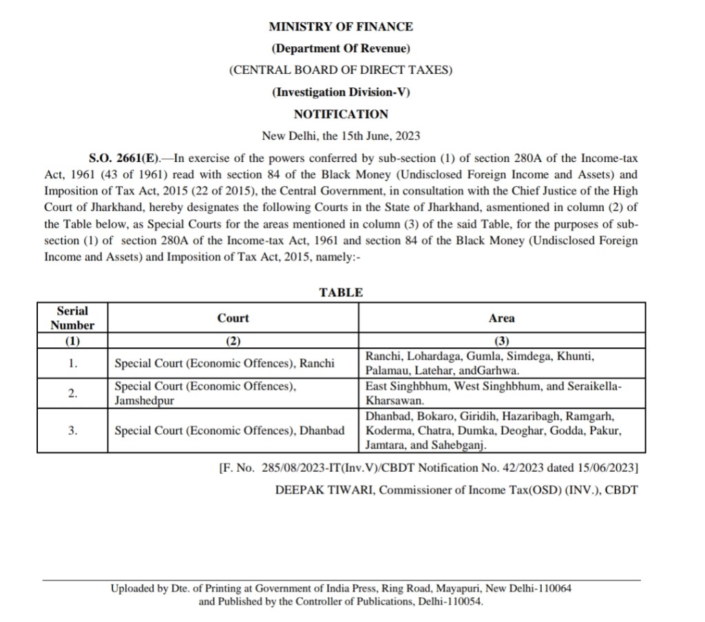 The Central Government, in consultation with the Chief Justice of the High Court of Jharkhand, has designated specific courts in the state of Jharkhand as special courts. These courts are listed in column (2) of the table mentioned in the notification. They have been designated as special courts for the areas specified in column (3) of the table. The purpose of establishing these special courts is to handle cases falling under subsection (1) of section 280A of the Income-tax Act, 1961, and section 84 of the Black Money (Undisclosed Foreign Income and Assets) and Imposition of Tax Act, 2015.