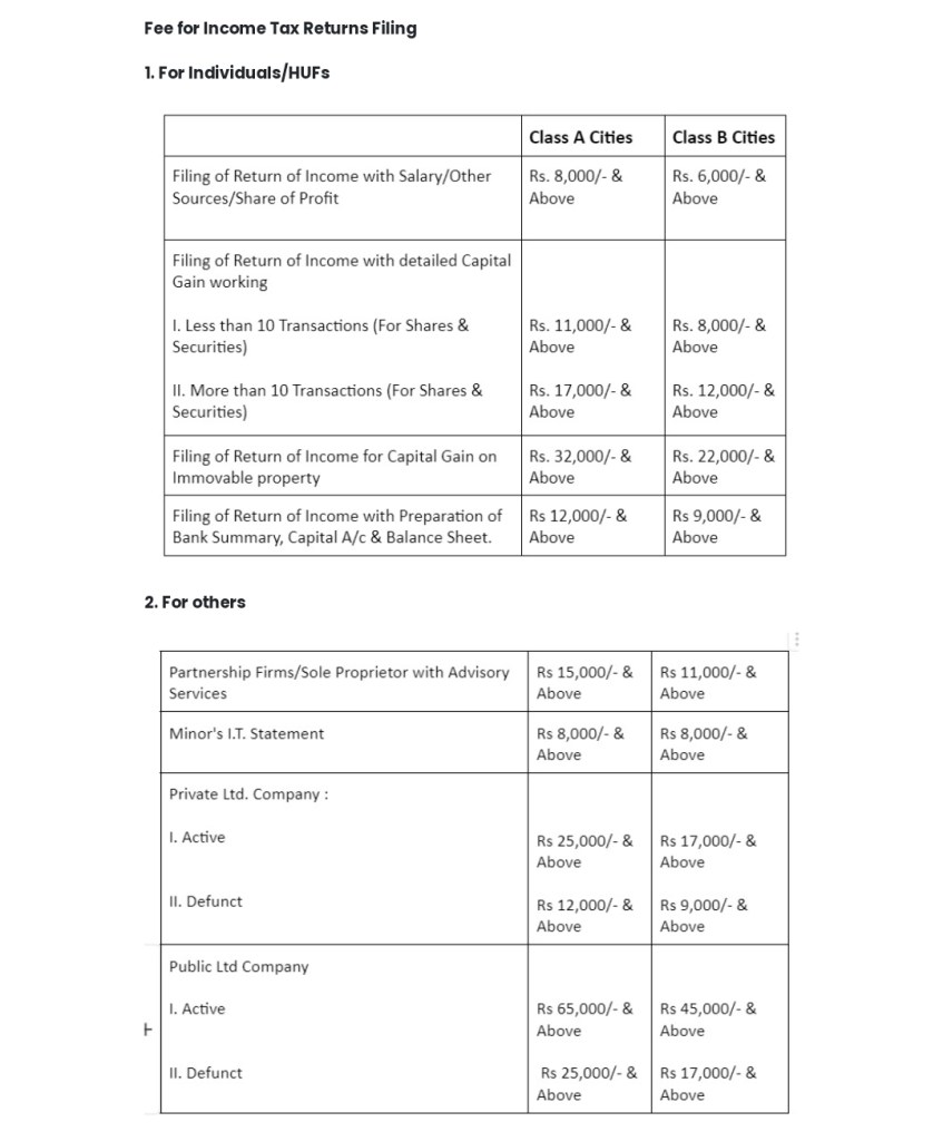 The Committee for Capacity Building of Members in Practice (CCBMP) at ICAI has established the recommended minimum fee scale for professional assignments carried out by CA Institute members. As part of their commitment to bolster Small & Medium Practitioners, the CCBMP at ICAI has introduced a Revised Minimum Recommended Scale of Fees for professional assignments performed by their members. The committee has proposed distinct minimum fees for ITR filing in Class A Cities and Class B cities.”
