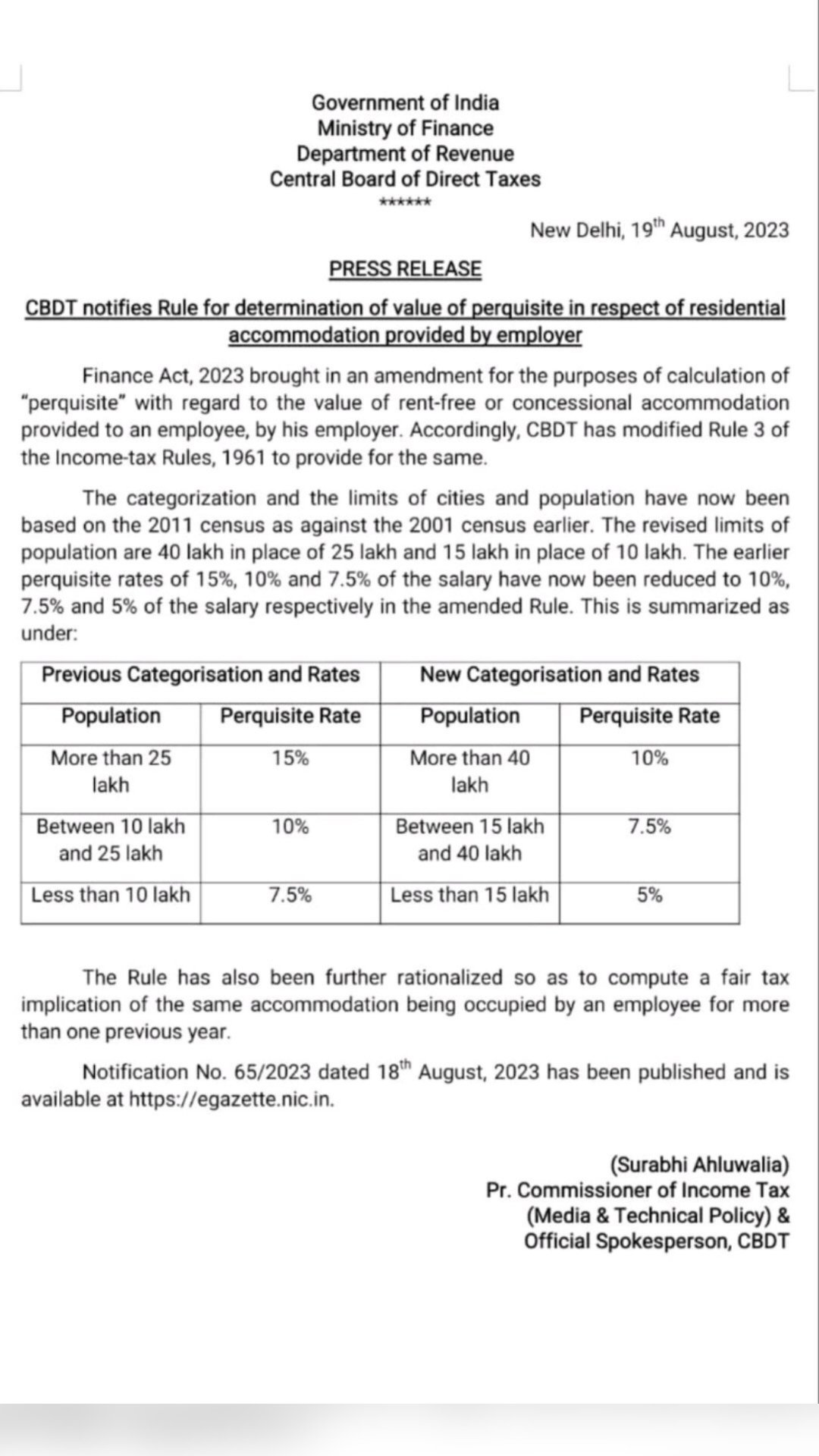 CBDT notifies Rule for determination of value of “perquisite” in respect of residential accommodation provided by employer to an employee. Notification No. 65/2023 dated 18th August, 2023 has been published and is available at egazette.nic.in