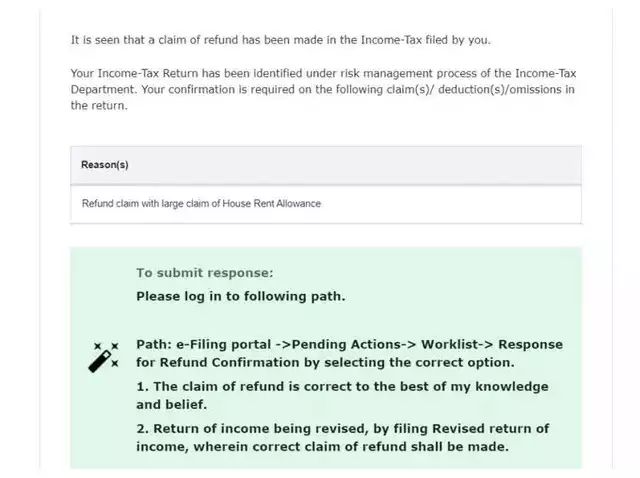 “It is seen that a claim of refund has been made in the Income-Tax filed by you. Your Income-Tax Return has been identified under the risk management process of the Income Tax Department. Your confirmation is required on the following claims(s)/deductions(s)/omissions in the return,” said the Income tax department on a intimation sent to a taxpayer