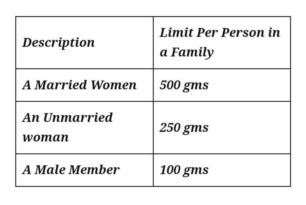 (b) Where the jewellery is within the prescribed limit i.e. 500 grams for married lady, 250 gram for unmarried lady and 100 grams for male members.