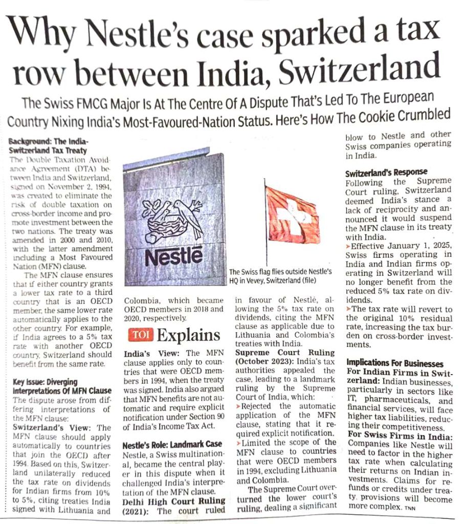 •The Double Taxation Avoidance Agreement (DTA) between India and Switzerland signed on 2nd Nov 1994